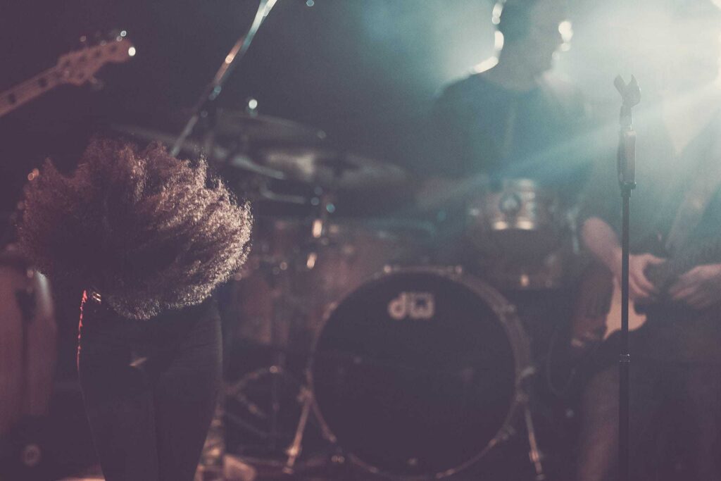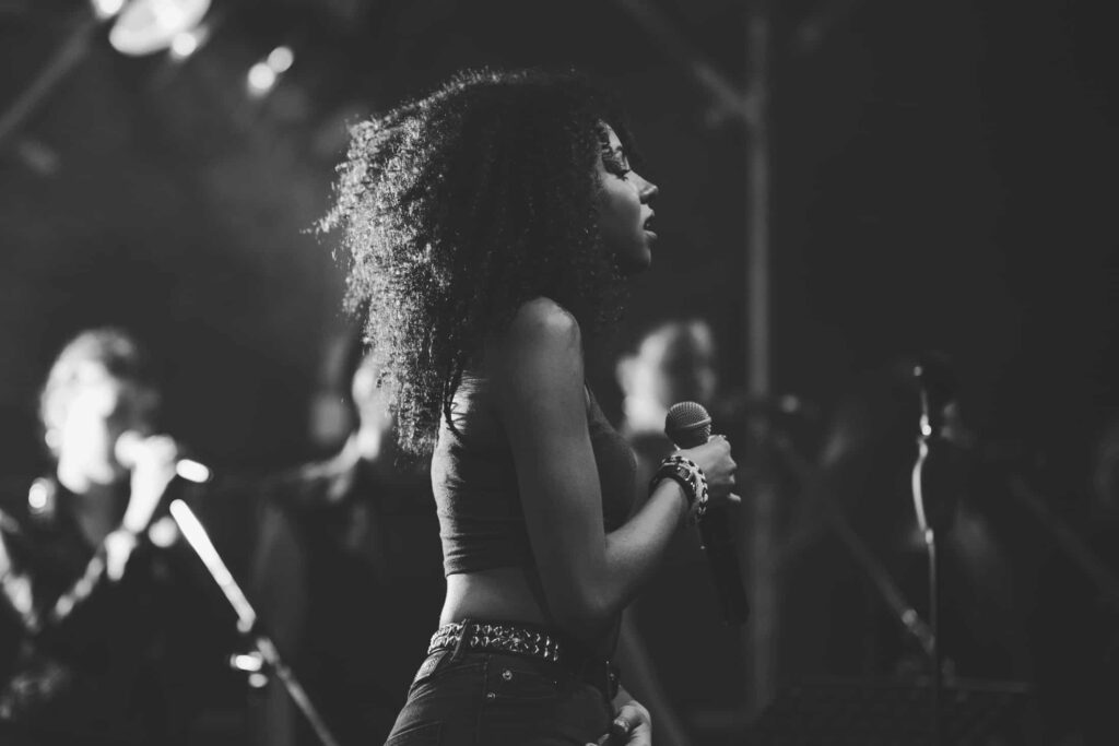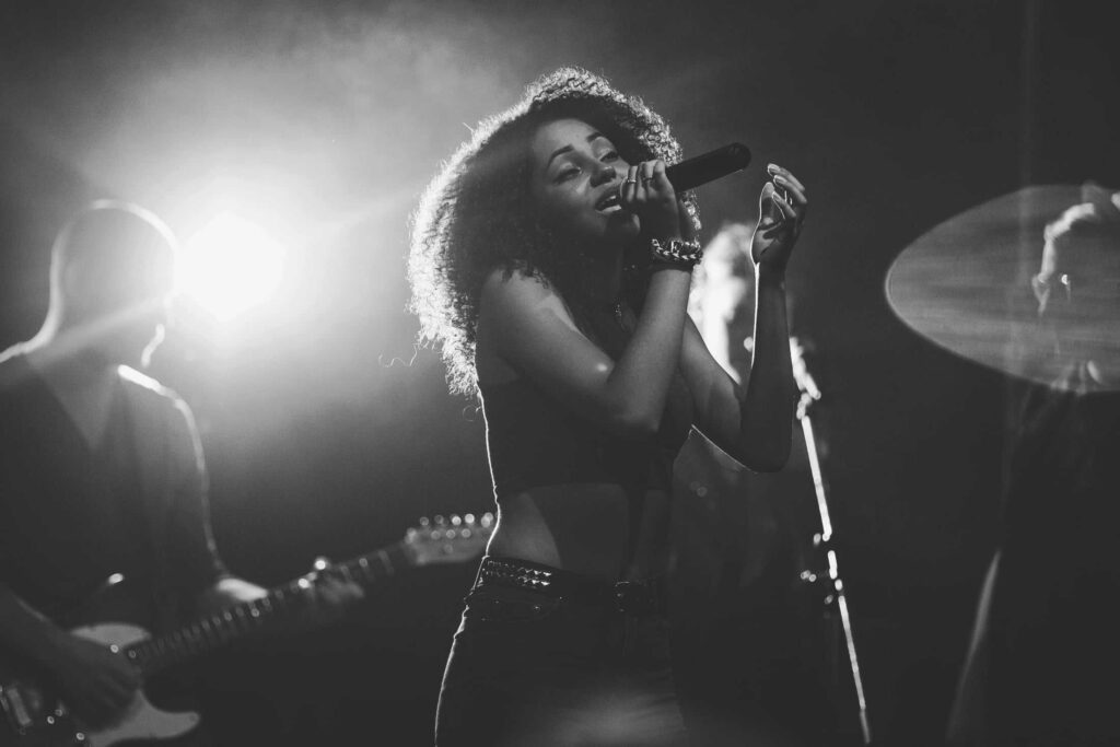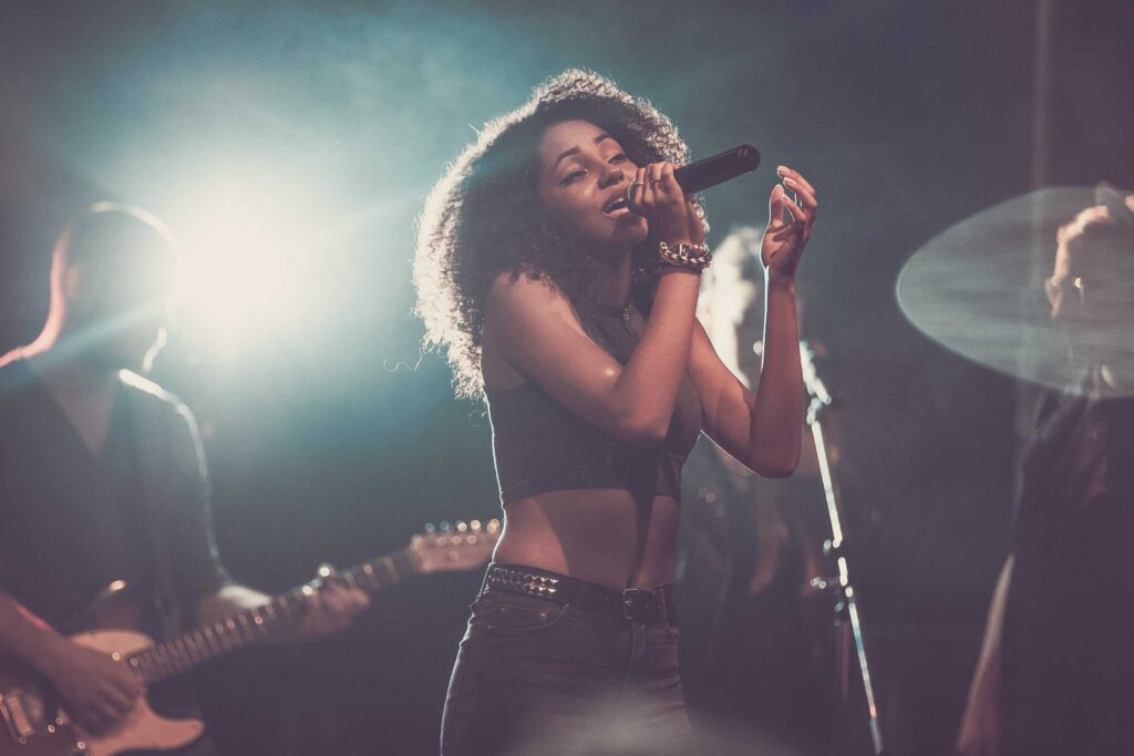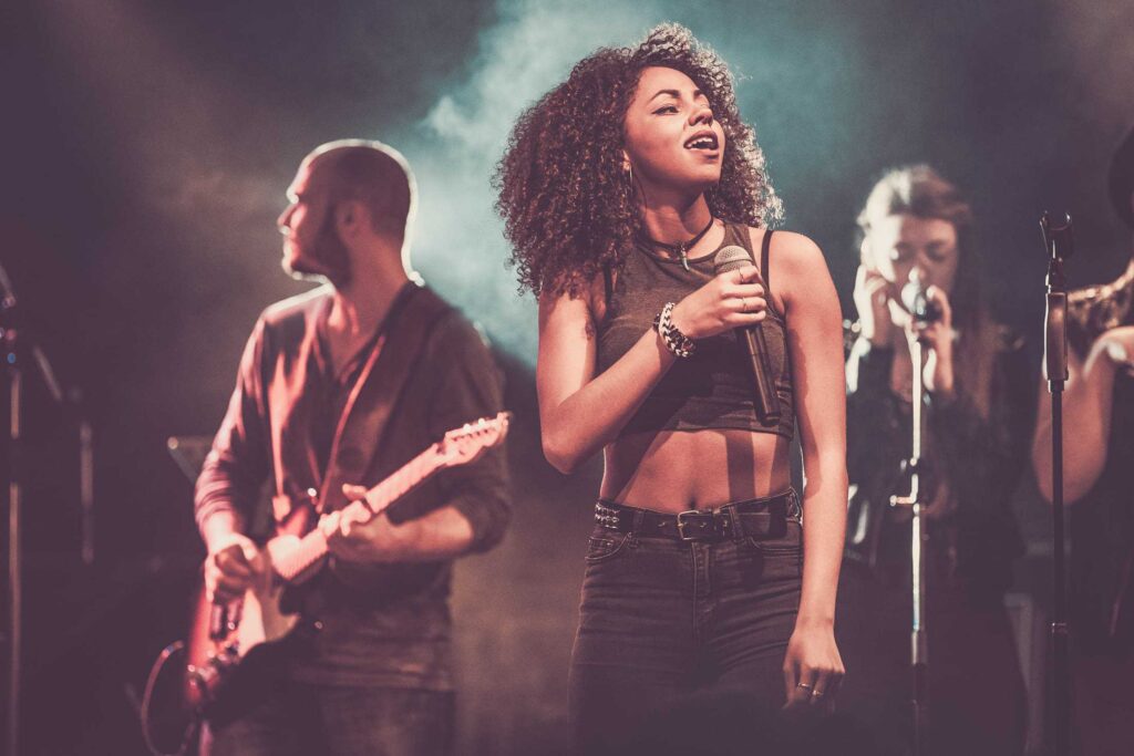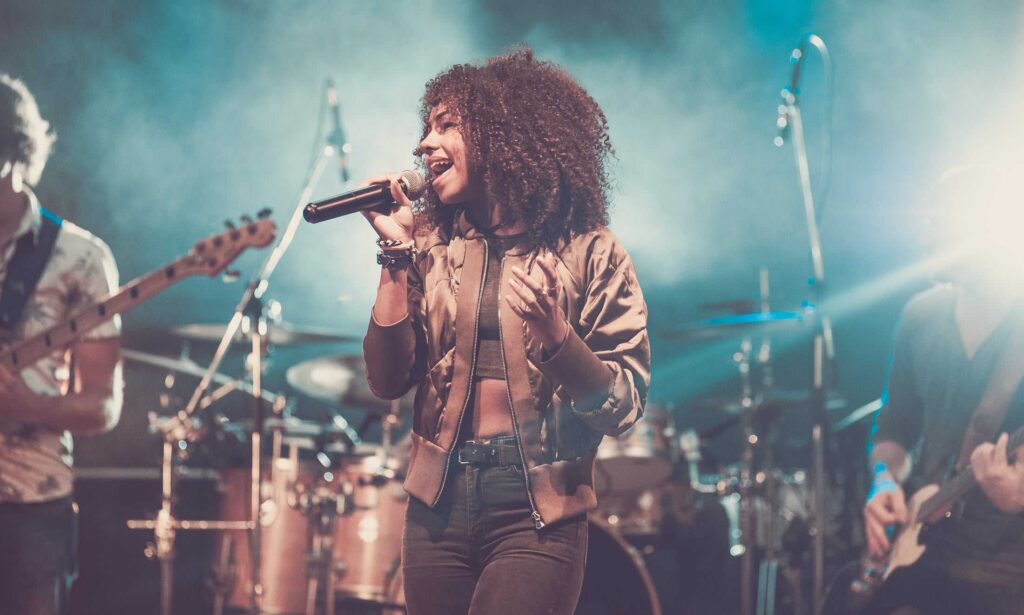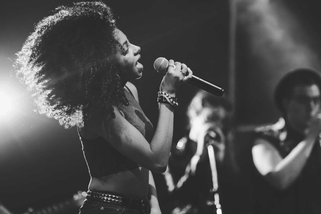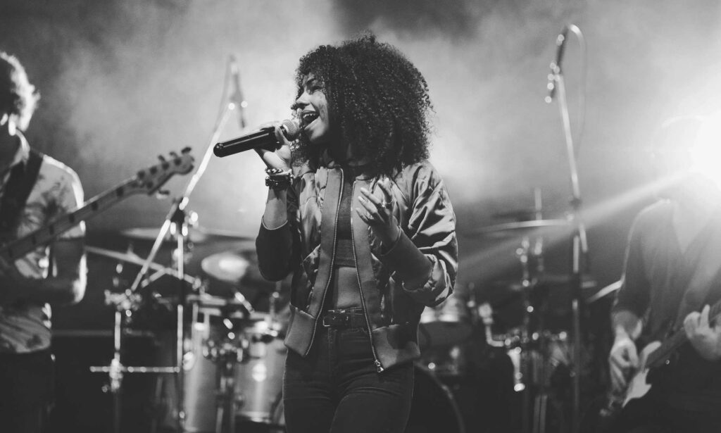 Eine Frau mit lockigem Haar singt auf der Bühne in ein Mikrofon, das von hellen Lichtern angestrahlt wird, während ihre Band im Hintergrund spielt - so wie die kreative Energie bei einer Veranstaltung der Webdesigner Aachen.