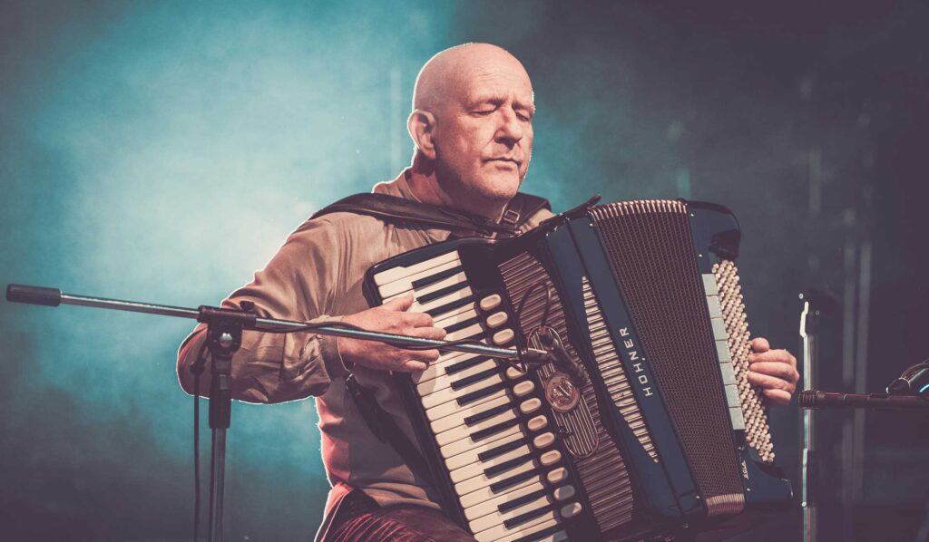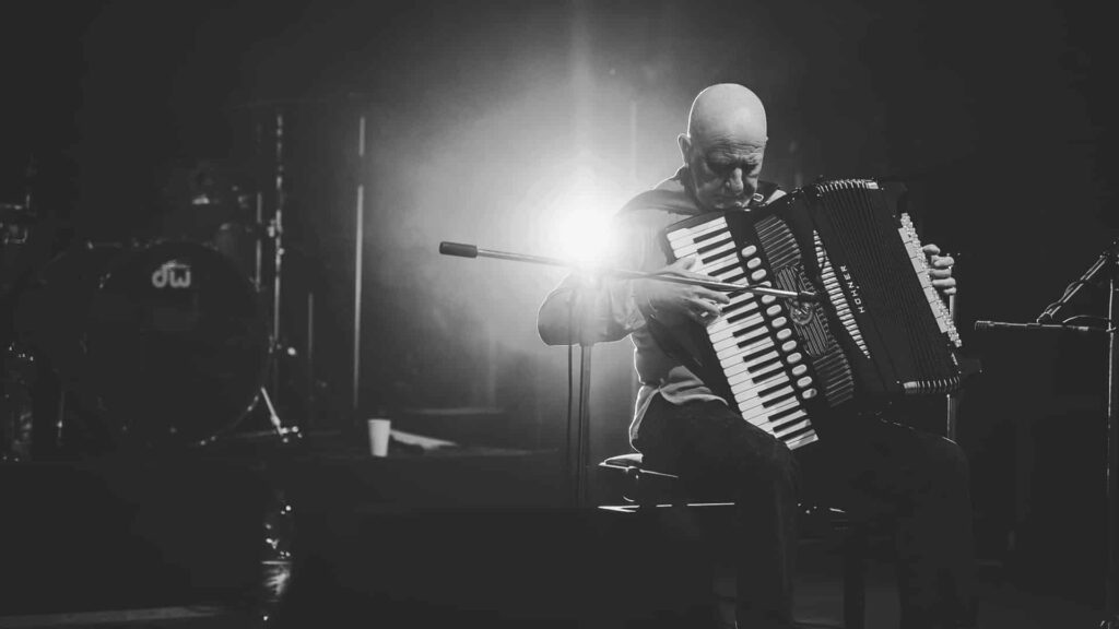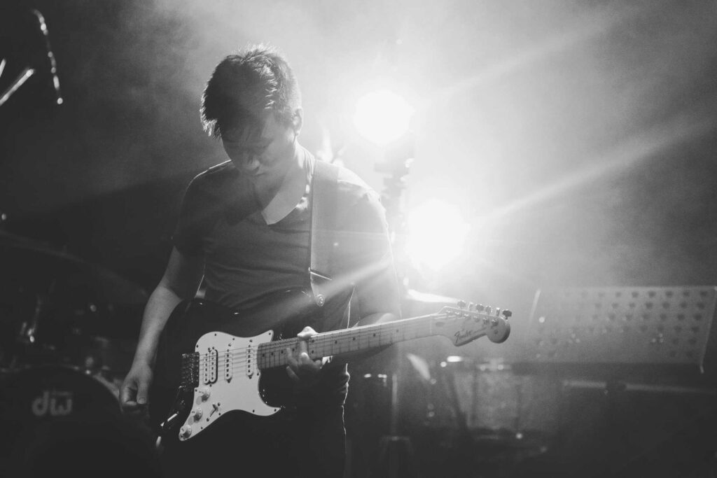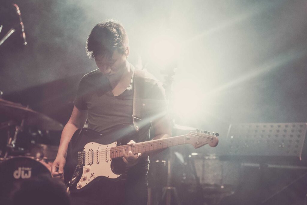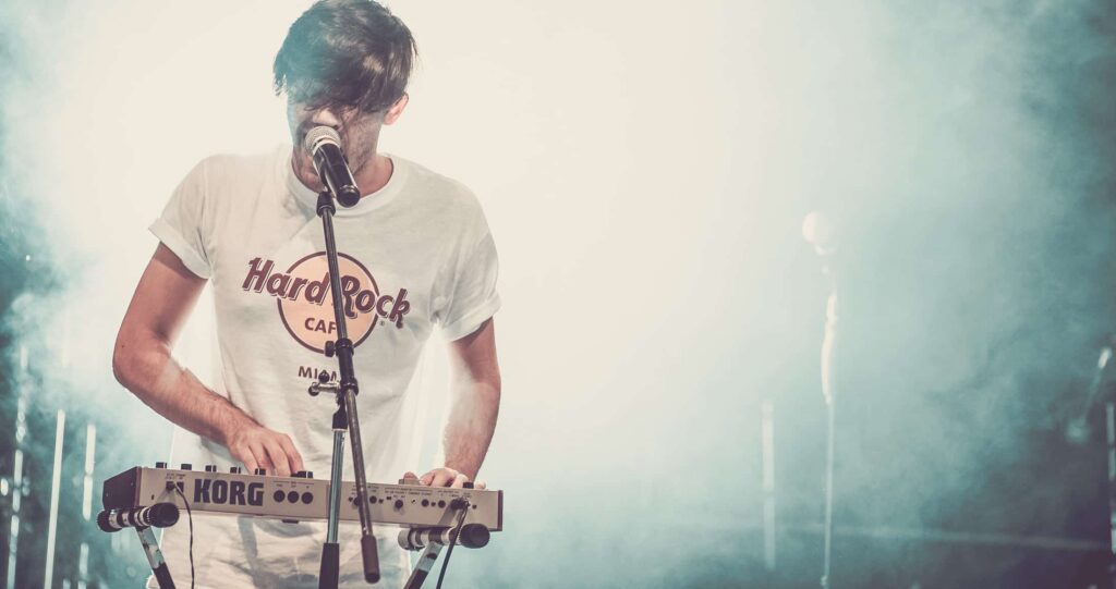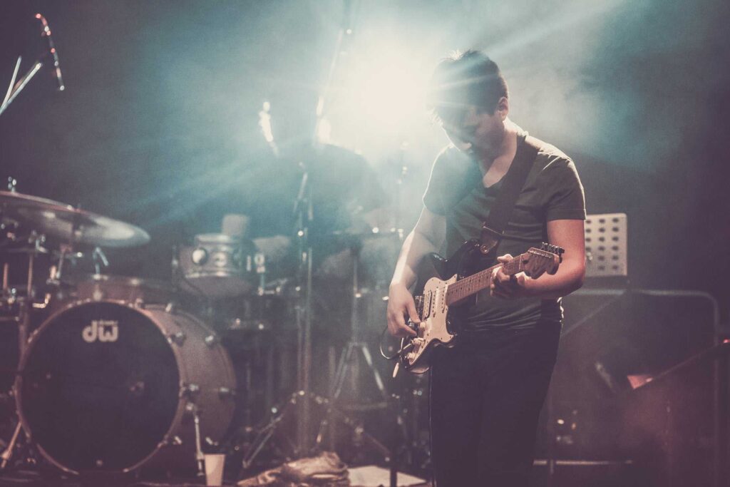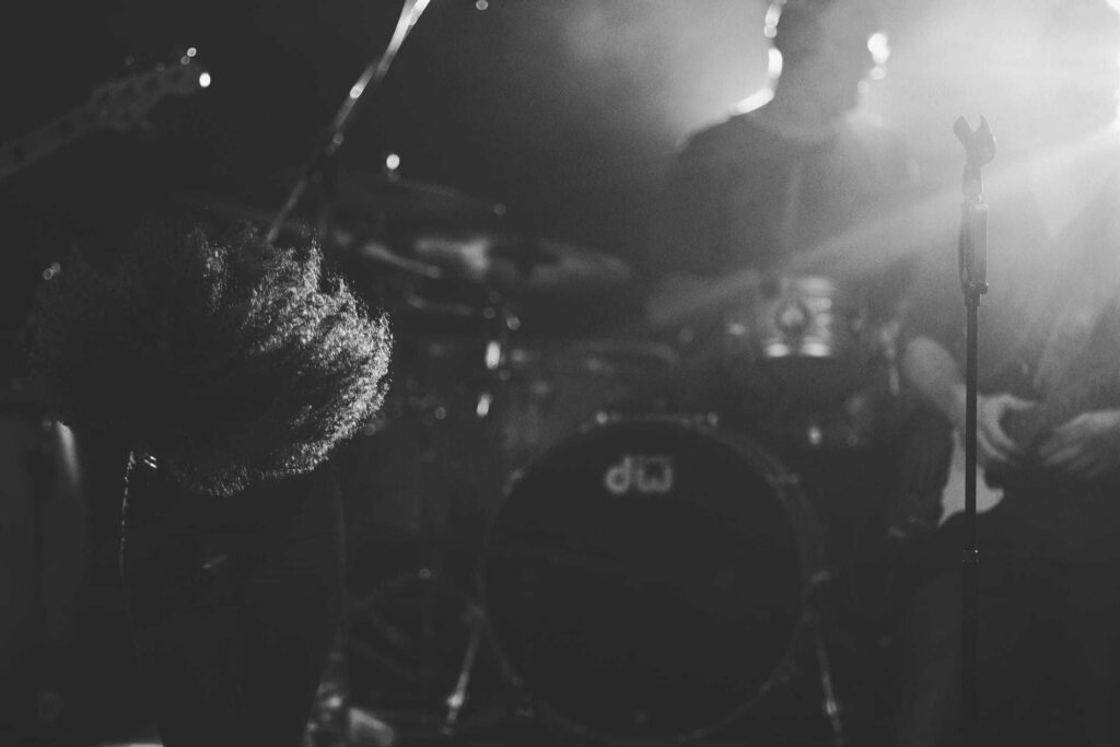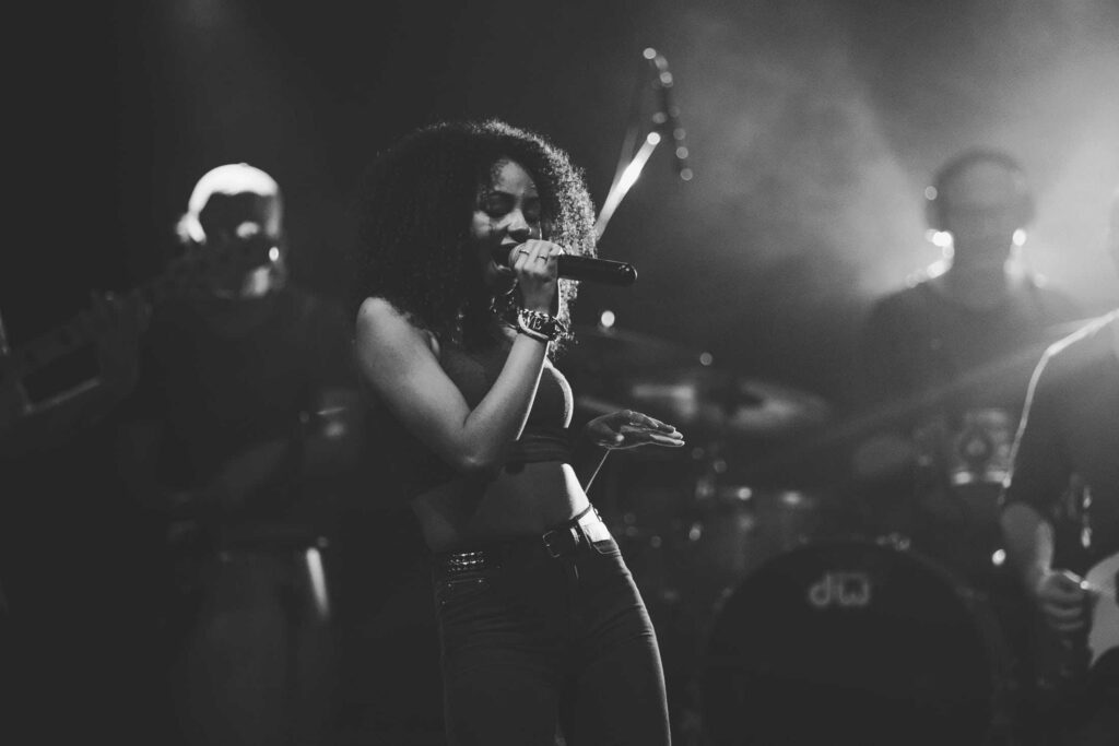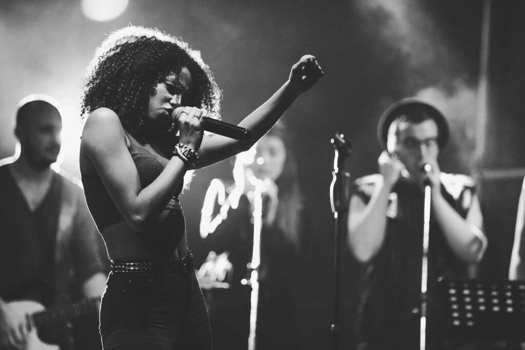 Eine Frau mit lockigem Haar singt auf der Bühne in ein Mikrofon, das von hellen Lichtern angestrahlt wird, während ihre Band im Hintergrund spielt - so wie die kreative Energie bei einer Veranstaltung der Webdesigner Aachen.