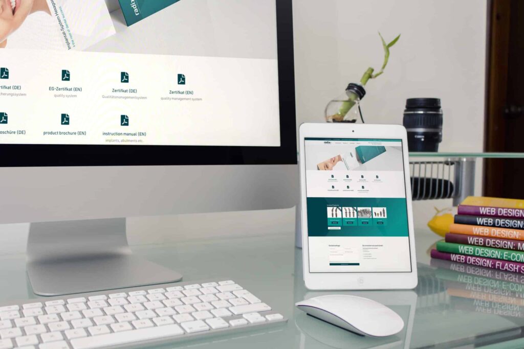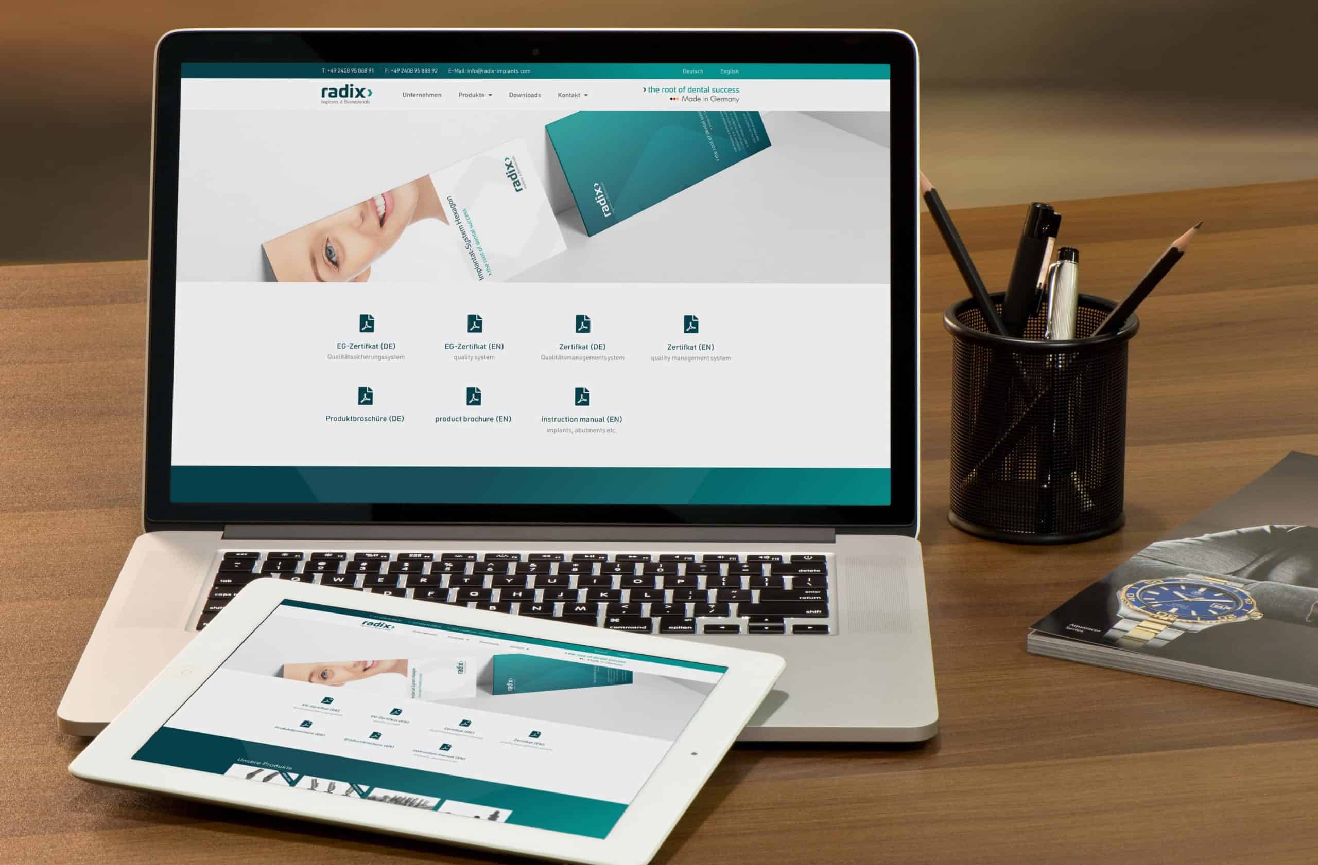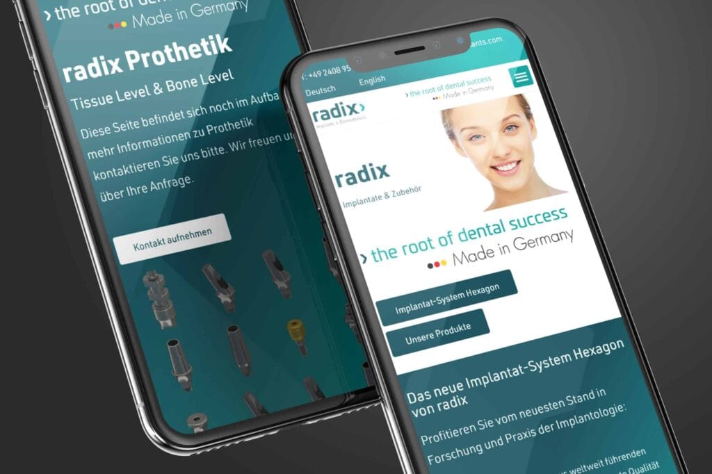 Screenshot der Homepage von Radix Implants, erstellt von einem führenden Webdesigner in Aachen, mit einer lächelnden Person, einem Navigationsmenü, einem Willkommensgruß, Produktbuttons und einem Text, der "die Wurzel des zahnmedizinischen Erfolgs - Made in Germany" hervorhebt.