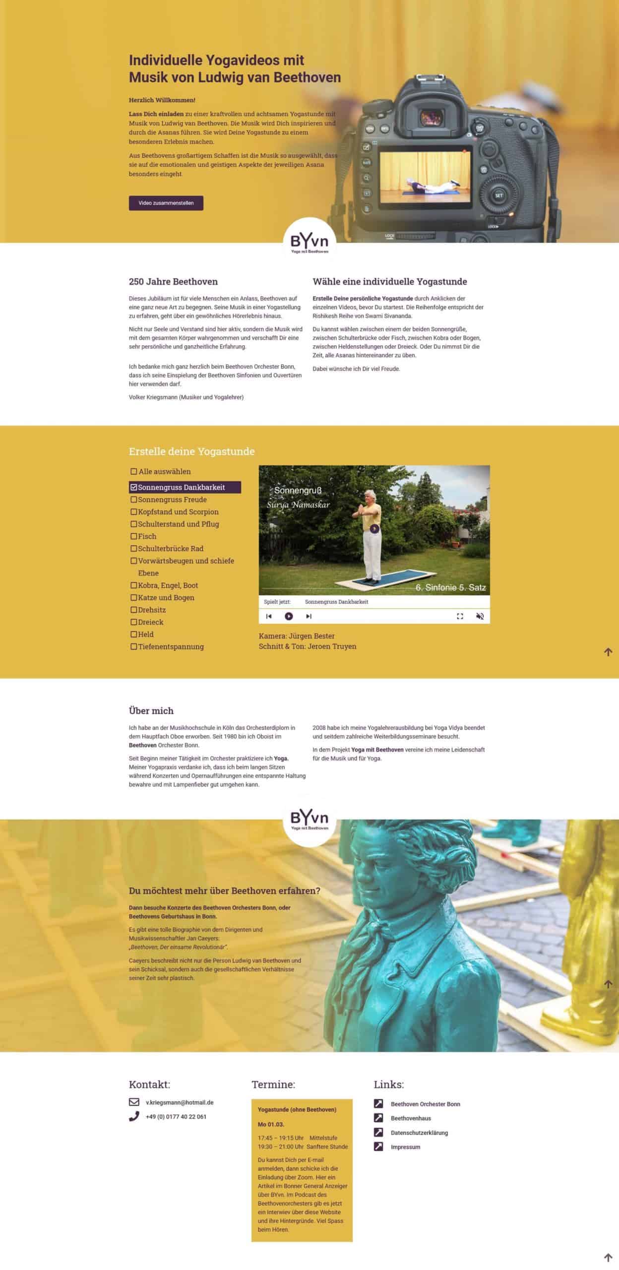 Eine Digitalkamera auf einem Stativ nimmt eine Frau auf, die in einem Haus Yogaübungen macht. Der Text wirbt für individuelle Yoga-Videos mit Musik von Beethoven. Erstellt von einem Experten für Webdesign in Aachen. Ein lila Button darunter lautet "Video zusammenstellen.
